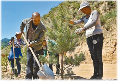 2017年5月26日,岚县界河口镇会里村村民在种树。