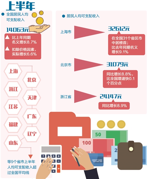 从省份看,上海、北京、浙江、天津、江苏、广东、福建、辽宁、山东等9个省市上半年人均可支配收入超过全国14063元的平均线;从增速看,有19个省区市的人均可支配收入同比增速跑赢全国8.7%的增速。