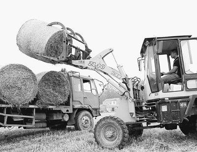 秸秆叉草机活跃在泗阳的田间地头,将打捆的秸秆装车。(张耀西摄)