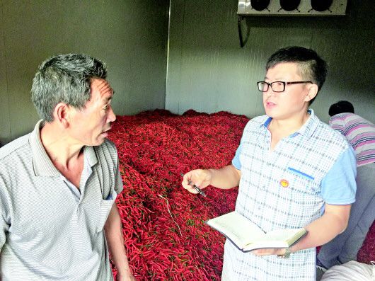 余芝荣(右)在鼠场村辣椒收购点查看辣椒收购情况。