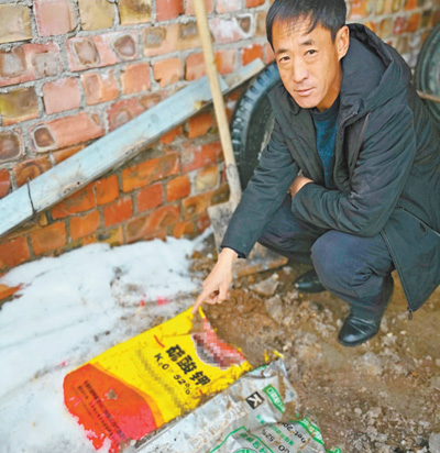 种植户贾富良家里剩下的假冒伪劣“硫酸钾化肥”。