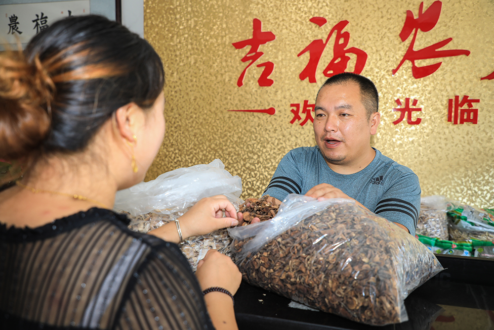 吴良宝在自家农家乐里向游客推荐当地的山货。 张俊摄