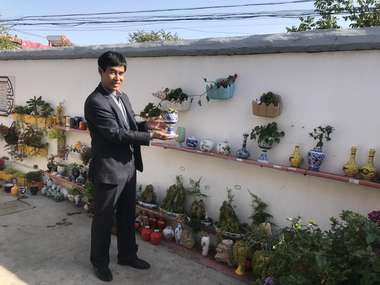 村民张泽云向记者展示他自己制作的小盆栽(10月28日摄)。
