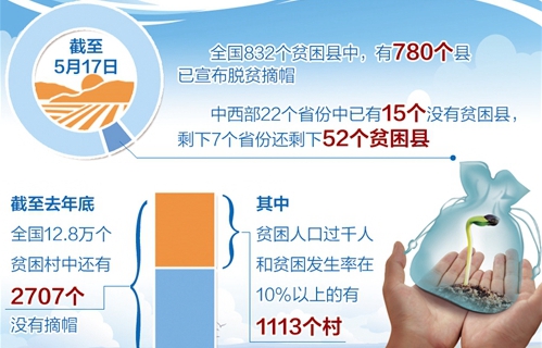 刘永富介绍,全国832个贫困县,截至5月17日,有780个县已宣布脱贫摘帽。中西部22个省份中已有15个没有贫困县,剩下7个省份还剩下52个贫困县。全国有12.8万个贫困村,到去年底还有2707个没有摘帽。这2707个贫困村中,贫困人口过千人和贫困发生率在10%以上的有1113个村。国务院扶贫开发领导小组办公室对没有摘帽的52个县和1113个村实施挂牌督战。目前为止,7个省份都制定了挂牌督战的实施方案,所有的县和村都制定了作战方案。另外,对这些挂牌的县,中央财政和省级财政加大投入,仅中央和省级财政对这52个贫困县就投入了308亿元资金,各省份对1000多个村在扶贫资金上也给予了倾斜。