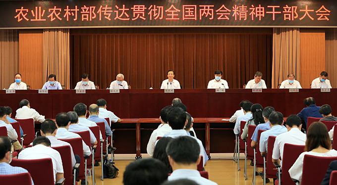 5月29日,农业农村部召开传达学习贯彻全国两会精神干部大会。农业农村部党组书记、部长韩长赋强调,农业农村部党组坚决拥护十三届全国人大三次会议和全国政协十三届三次会议作出的各项决定和决议,部系统各级党组织和广大党员干部要认真学习贯彻习近平总书记重要指示和两会部署要求,切实把增强“四个意识”、坚定“四个自信”、做到“两个维护”落实到思想和行动上,不折不扣抓好中央决策部署和政策措施落实,扎实做好农业农村各项工作,稳住农业农村发展好形势,为维护经济发展和社会稳定大局提供有力支撑,为持续推进乡村振兴、打赢脱贫攻坚战、全面建成小康社会作出应有贡献。