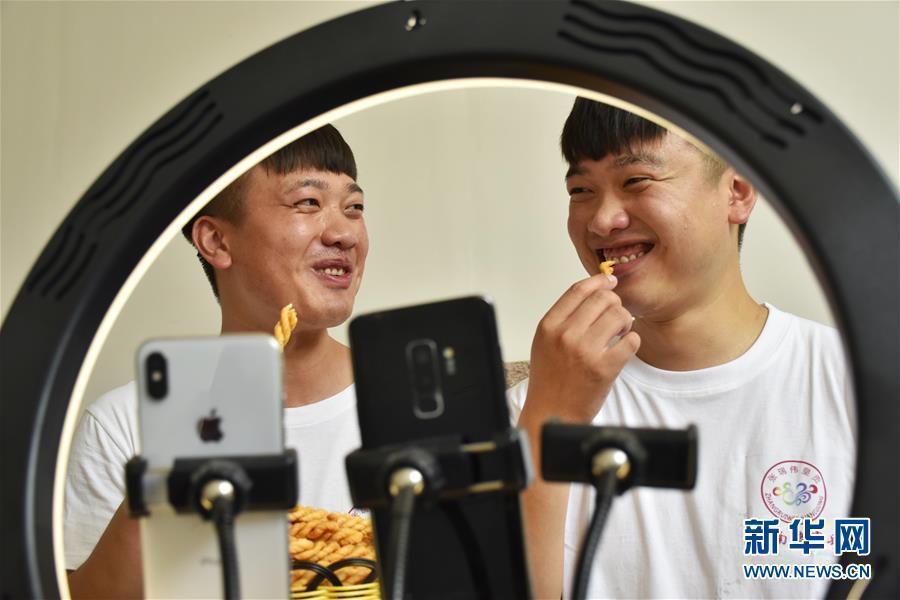 7月8日,张亚博(左)、张亚钊兄弟在直播带货。 新华社记者 韩朝阳 摄