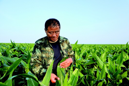 ▲陈华在黑龙江省绥棱县靠山村玉米地里查看玉米长势(7月10日摄)。本报记者齐泓鑫摄