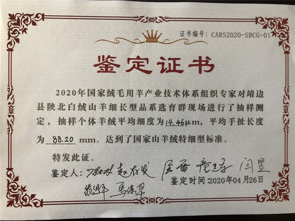 靖边白绒山羊绒毛鉴定证书