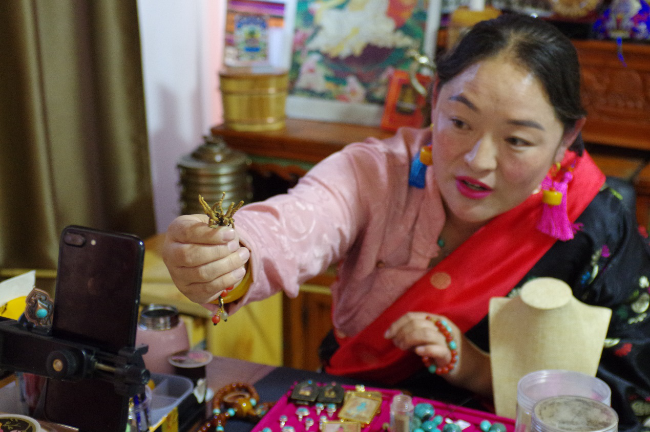 来自青海的农民主播卓玛在直播间介绍虫草是如何挖出来的