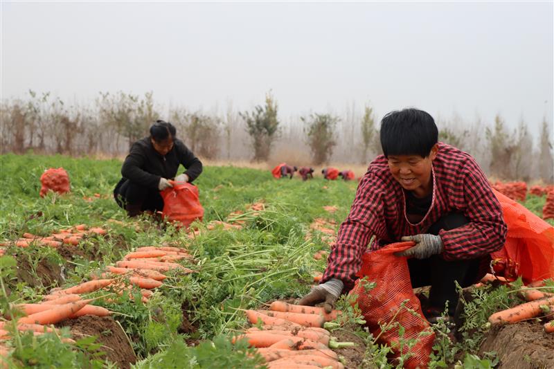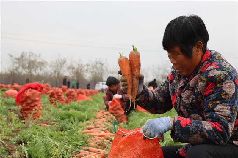 大田里随着采收机往返,红红的胡萝卜顷刻从地里翻出身子,满目红根绿缨丰收喜人色。“你看这分量,这个头,绝对的大丰收,预计亩收益在4500元到5000元。”近日,在河北省隆尧县柳行农场林业分场400亩胡萝卜种植基地,合作经营人、北京志达方圆科技有限公司经理武青云掐起一大把机采收胡萝卜,一个劲地夸赞说“长得好、长得好”。
