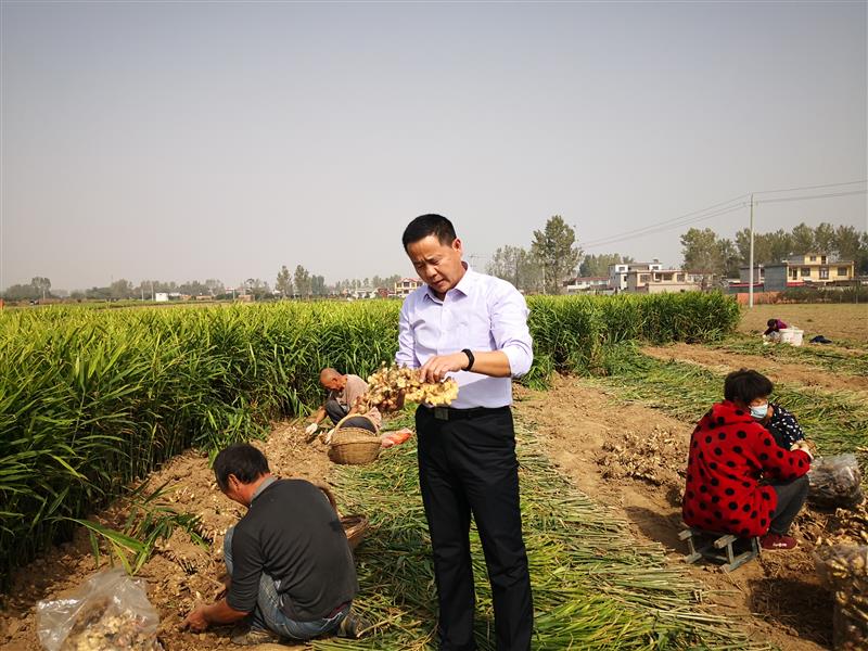 李红岗在田间查看农户所种植的小黄姜的品相。