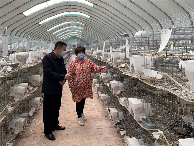 李红岗(左)在村民高贺玲的鸽舍里查看肉鸽长势。