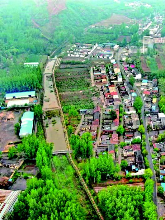 河南省“全国文明村”河口村人工湿地污水流入的燕沟河(4月25日摄,无人机照片)。新华社记者 刘诗平 摄
