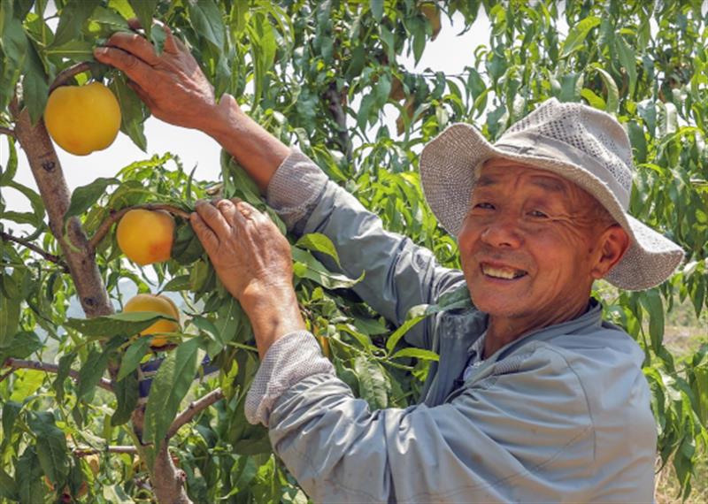 图说:阜平黄桃丰收季,采摘的当地果农。