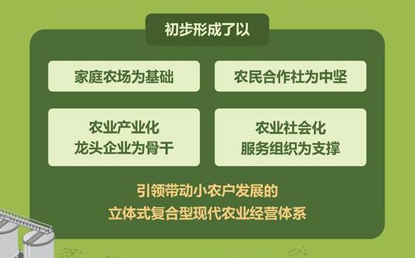 报告显示,在坚持农村基本经营制度和家庭经营基础性地位的前提下,初步形成了以家庭农场为基础、农民合作社为中坚、农业产业化龙头企业为骨干、农业社会化服务组织为支撑,引领带动小农户发展的立体式复合型现代农业经营体系。
