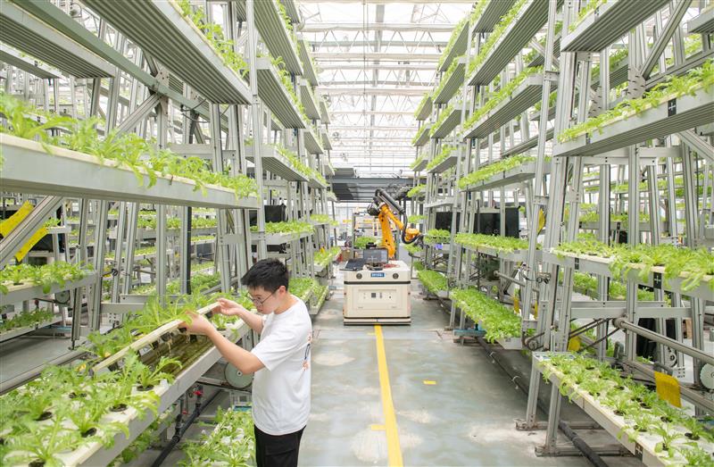 目前,鱼菜共生AI工厂内的蔬菜每平方米每年可收获80公斤,产量为露地栽培的5倍以上。养鱼密度每立方米可达100公斤,约为池塘养鱼的20倍以上,且相比传统养鱼,鱼的养殖周期缩短二分之一,可节省20%的饵料。