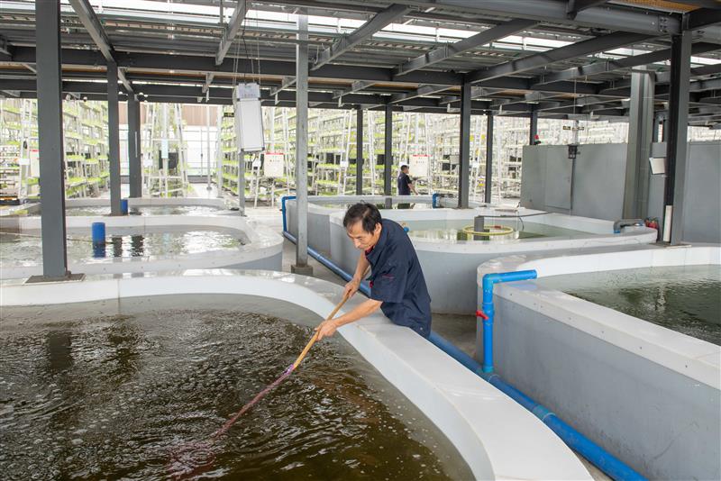 在工厂内的高密度养鱼池内,通过传感器可以实现养鱼水质精准监测预警,投饵、捕捞分级等作业可以实现机器换人,实现了补水、投饲、供氧、温控、粪污处理等各环节智能化作业。在蔬菜种植区,实现了“一粒种子到一棵菜”全程无人化作业。同时,鱼类养殖产生的养殖粪水被转化为肥料,用于蔬菜种植。
