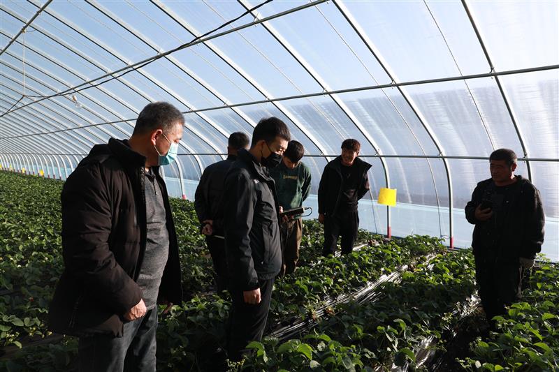 在大贵口村草莓大棚里,农技人员进行果蔬技术指导、培训,种植户虚心学习、请教,助力产业增收。商炜晨 摄