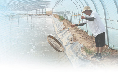 养殖人员在内蒙古杭锦旗黄河沿岸水产养殖基地查看虾苗长势。岳金鹤 摄