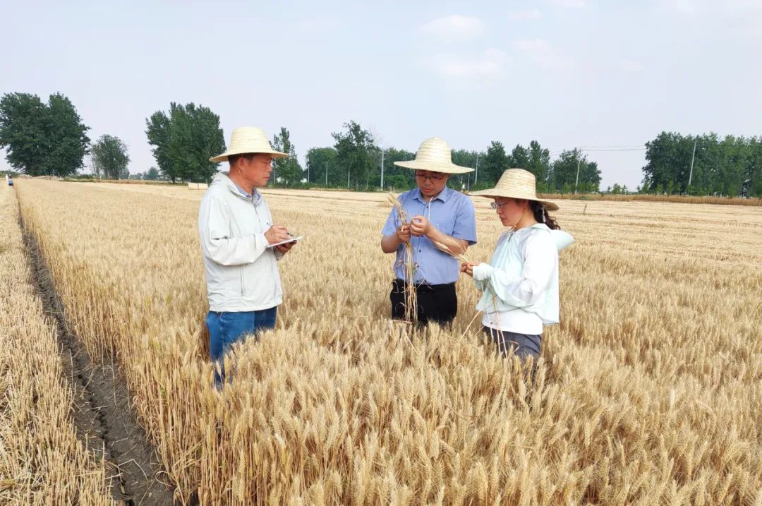 5月27日,河南省延津县农业农村局相关工作人员在高寨村察看小麦育种情况。