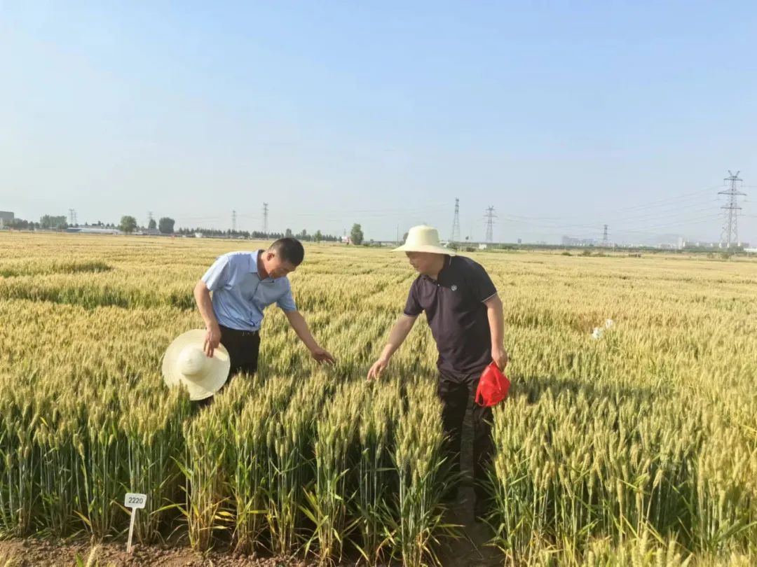 5月14日,河南省新乡市延津县农业农村局局长杨志刚(右)、副局长赵国栋(左)在僧固乡沙庄村察看小麦品种田间表现。