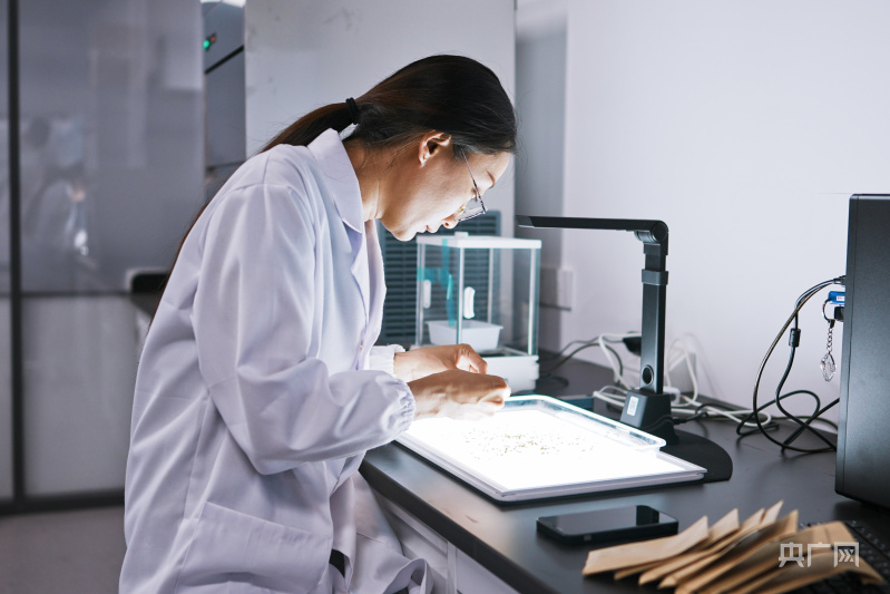 科研人员在实验室进行考种工作。央广网记者 张羲轮 摄