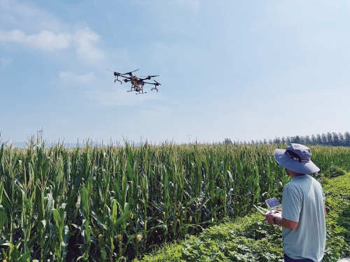 潍一农业农技师操作无人机在山东省昌乐县营丘镇董孟村玉米田里进行“飞防”作业。