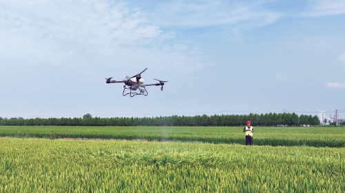 近日,农场农业管理人员正用植保无人机在水稻田里作业。 受访者供图