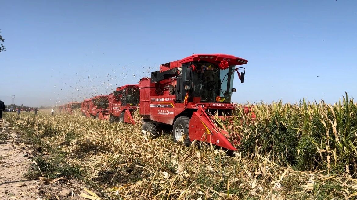 金秋九月的河西走廊,连片玉米田褪去青纱,空气中弥漫着丰收的清甜。9月8日上午,甘肃省张掖市甘州区碱滩镇普家庄村的农场田间格外热闹,21台“巨明机械”标识的制种玉米收获机整齐列阵,“巨明红”机身在阳光下格外醒目。备受瞩目的全省制种玉米收获机熟化样机投放及现场演示活动在“黄金育种基地”举行。