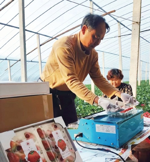张贯健的父母正在给草莓称重、打包。图片均由受访者提供