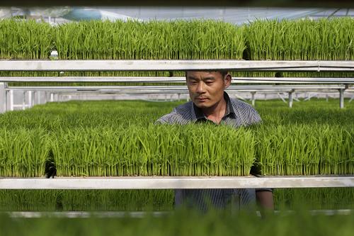 4月8日,在咸宁市咸安区双溪桥镇水稻集中育秧基地内,技术员陈武松在检查秧苗生长情况。新华社发(吴涛 摄)