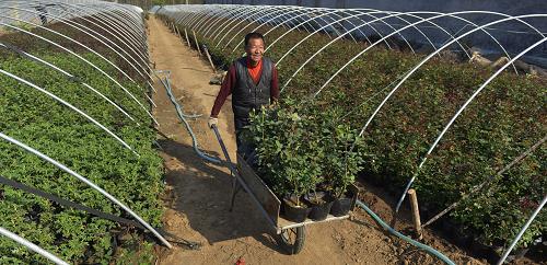 山东邹平县好生街道世纪花卉苗木专业合作社农民把月季苗从苗圃推出来准备销售(4月3日摄)。新华社发(董乃德 摄)