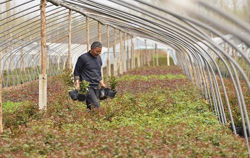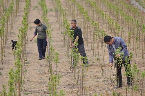山东邹平县好生街道世纪花卉苗木专业合作社农民在管理苗木(4月1日摄)。新华社发(董乃德 摄)