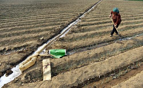4月9日,山东邹平县明集镇西宋村绿宝来蔬菜种植专业合作社农民在农场浇葱苗。该农场面积830亩,是蔬菜加工厂对接种植基地。新华社发(董乃德 摄)