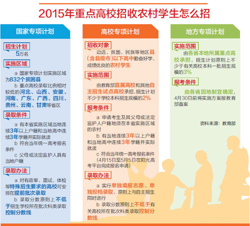 今年4月,教育部下发《关于做好2015年重点高校招收农村学生工作的通知》,规定今年将继续实施农村贫困地区定向招生专项计划、农村学生单独招生、地方重点高校招收农村学生专项计划三大专项计划,以畅通农村和贫困地区学子纵向流动渠道。