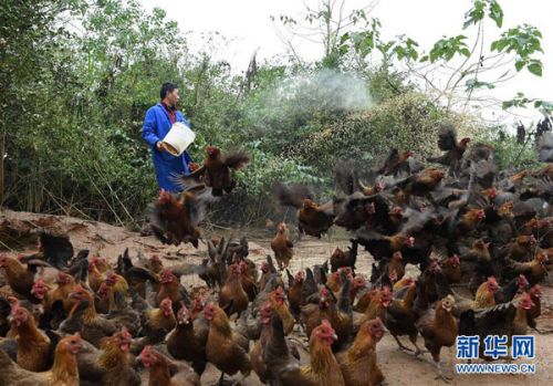 近年来,江西省崇仁县依托良好的生态环境,大力推进生态麻鸡养殖。2014年,崇仁麻鸡鸡肉产品通过农业部“无公害农产品”认证。目前,崇仁县已有麻鸡养殖专业户2000多户,出栏麻鸡5200万羽,通过传统与网络销售等手段闯出大市场,当地今年的产值已达12亿元,户均增收5万元左右。新华社记者 周华 摄