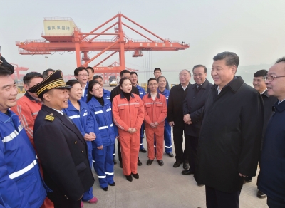1月4日至6日,中共中央总书记、国家主席、中央军委主席习近平在重庆调研。这是1月4日下午,习近平在重庆两江新区果园港与现场作业人员亲切交谈。