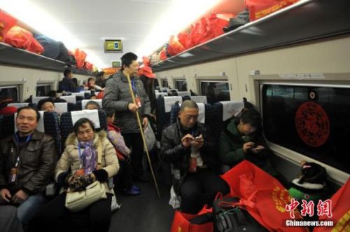爱心专列D5996次动车从武汉火车站启程,满载着600多名农民工兄弟姐妹踏上返乡的旅程。 中新社记者 张畅 摄