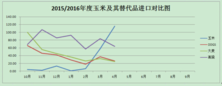 据数据显示,4月玉米进口量115.55万吨,同比激增720.44%,1-4月累计进口180.11万吨,同比增加31.1%。4月DDGS进口26.3万吨,同比减少57%,1-4月进口110.76万吨,同比增加11.15%。4月中国大麦进口24.81万吨,同比减少75%;1-4月累计进口119.54万吨,同比下降67.37%。4月中国高粱进口63.23万吨,同比减少37%,环比减少24%。从4月进口品种来看,玉米大幅增加,但大麦、高粱、DDGS进口量均出现不同程度下降,但进口玉米及替代谷物的不断到港,依然冲击国内玉米市场,据了解,广州港乌克兰玉米报价1480-1500元/吨,法国大麦报价1610-1620元/吨,澳大利亚大麦1630-1640元/吨。美国高粱报价1680-1700元/吨,和国内玉米价格相比,依然存在一定价差,如国内玉米价格上行幅度过大,企业无法接受高价原粮,市场将继续复制2015年市场行情,转为采购价格相对低廉的进口玉米及谷物做为替代品。