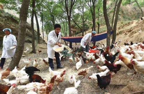 6月2日,山西省吕梁市临县兔坂镇砖瓦村村主任武雪峰(中)和村民一起在山沟里给散养的鸡喂饲料。