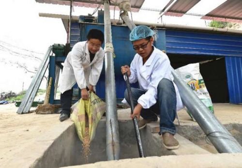 6月2日,山西省吕梁市临县兔坂镇砖瓦村村主任武雪峰(左)和鸡场工作人员一起搅拌鸡饲料。