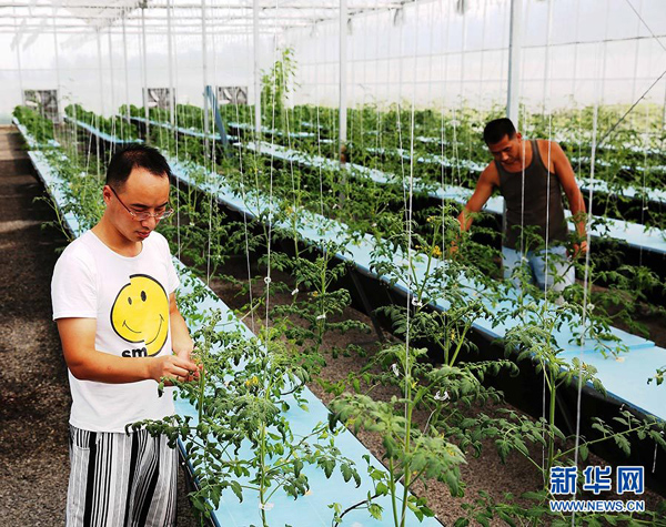 8月7日,周伟(左)和同事在“气雾栽培”生态园内查看番茄生长情况。