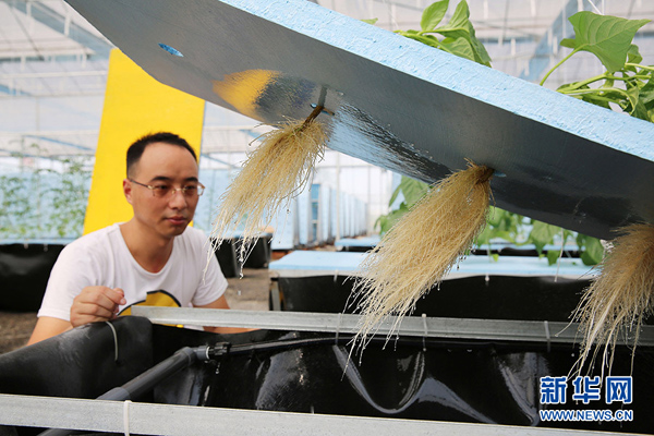 8月7日,周伟在“气雾栽培”生态园内检查自动喷雾喷洒辣椒根系的情况。