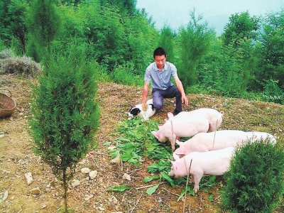 他养的猪并不多,却坚持绿色喂养,让猪在山坡上自由活动。虽然一头猪要喂上一年,但刘德斌觉得这种生态猪的经济效益比饲料猪更可观。