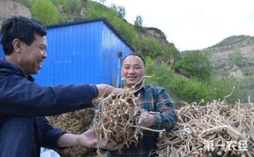 图:苗建军正在收购农户们的黄芪