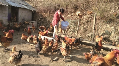 图为江湖正在喂鸡。