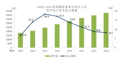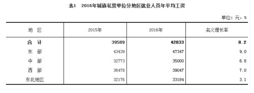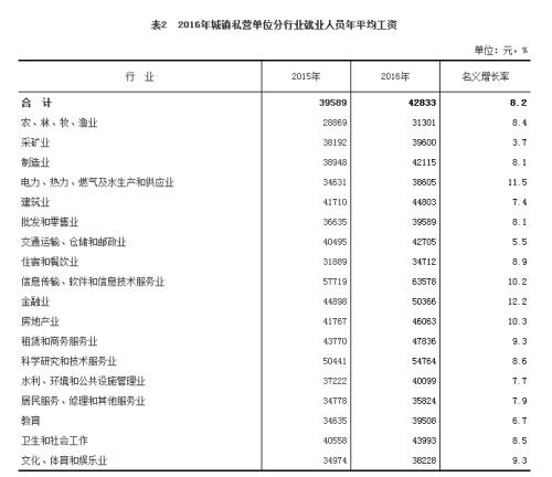 据国家统计局网站消息,2016年全国城镇私营单位就业人员年平均工资为42833元,与2015年的39589元相比,增加了3244元,同比名义增长8.2%,增速比2015年回落0.6个百分点。扣除物价因素,2016年全国城镇私营单位就业人员年平均工资实际增长6.0%。