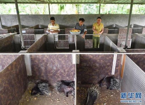 28岁的刘福财是海南省五指山市番阳镇番阳四村村民。高中毕业后,他在家乡成立了养殖合作社,先后养过猪、鸡、鸭,也种过香蕉,但都利润微薄。2015年,刘福财尝试养了6头豪猪,取得不错的收益。2016年5月,他专程赶赴湖南省桃源县考察,学习豪猪饲养的经验技术。回来后,刘福财做通家人的工作,将原先准备盖新房子的12万元拿出来,在原有合作社养殖场的基础上,建起占地300平方米的沼气生态循环豪猪养殖场,并在当地政府的协调帮助下,以“政府+合作社+贫困户”模式,带动番阳三村、四村共27户贫困户加入合作社,参与豪猪养殖。目前,刘福财的豪猪养殖场内饲养豪猪100多头,贫困户定期轮流来劳动和学习养殖技术。预计到今年底,可以出栏近200头豪猪,届时每户贫困户可以获得4000多元的利润。刘福财说:“豪猪养殖成本低、利润高,我对养殖豪猪有信心。”同时,他希望能逐步扩大养殖规模,把产业做大,“我不仅要带动贫困户脱贫,还要带着大伙一起致富奔小康”。
