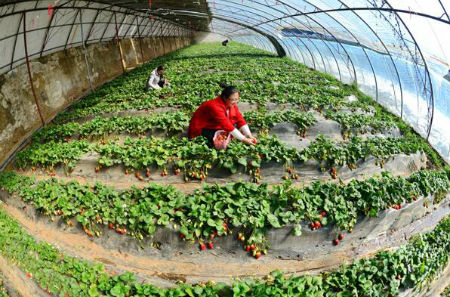 游客在巨鹿县东辛庄村的“扶贫大棚”内采摘草莓(2月24日摄)。