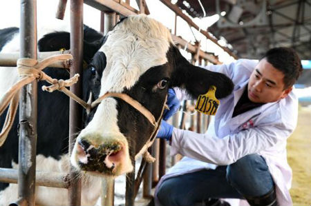 河北省巨鹿县三田乳业奶牛养殖场的员工在给奶牛防疫(2016年12月2日摄)。